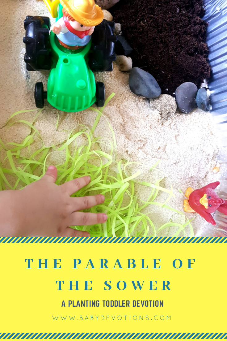 At church a couple of weeks ago, our pastor preached about the Parable of the Sower (Matthew 13:3-9). He talked about how our job is to sow seeds to those around us, and at the end of the service they past out seeds as a visual reminder to sow seeds. Let’s just say, I felt inspired. As a stay at home mom, the main people I interact with are my little people. And every day lends opportunity to sow seeds in their life. Every time we read a story together, every time they ask for my attention, and even every tantrum is a chance to sow seeds into their lives. We’re our children’s first teachers, and we have the opportunity to sow the seeds of God’s word into their lives. That’s why I started doing baby devos, to help engage them and spread some of those seeds. So then I just ran with that thought and started brainstorming a baby devotion on the sower. Here’s what we did: