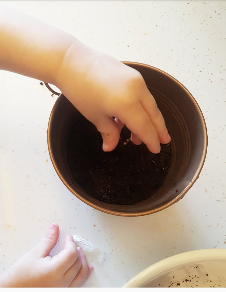 This is such a great sensory project and if your kid loves dirt, this is for you. My kid does not like dirt, but I gave her some tools (a fork and spoon) and she still had fun playing. Target even has seed-growing kits in their dollar section.