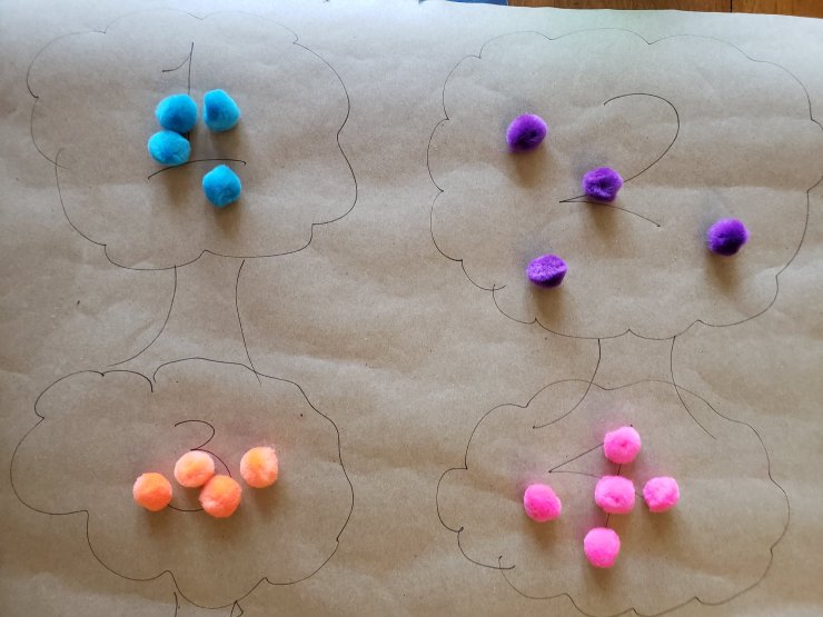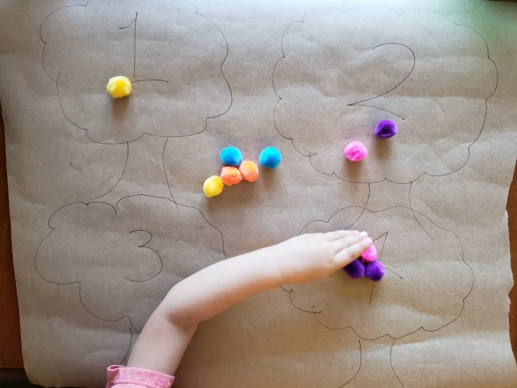 Then have your child put the correct number of pompoms “fruit” on each tree. This works best with older toddlers and preschoolers.