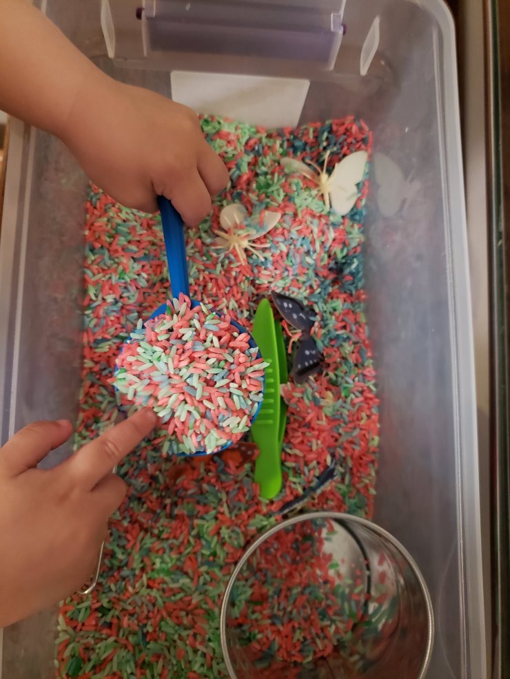 This was so simple. Just dump items in a tub, and you’re good to go. We had hours of fun throughout the week. We had fun hiding and finding the butterflies in the rice. Vale attempted to pick up the butterflies with the tools and also scooped the rice into her little bucket. So much fun.