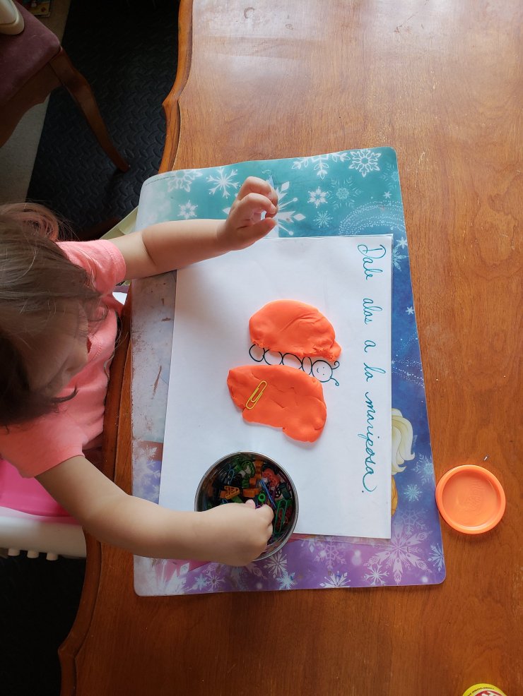 We made a butterfly playdough mat. I drew the body of a butterfly on a piece of paper and covered it with contact paper. Then we made wings out of playdough and Vale decorated them with beads.