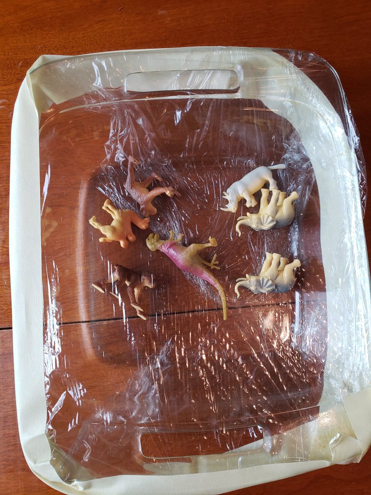 For Vale (2 years-old), I placed a bunch of her favorite toys in a baking dish and covered it with plastic wrap. I secured the wrap with painters tape, and poked a few holes in the top with a toothpick.