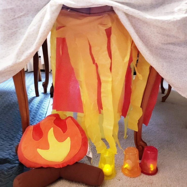 We made a fiery furnace. Naomi has been obsessed with playing under the table, so I seized the opportunity.