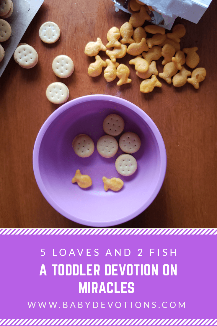 - When we got to the part about the little boy with the 5 loaves and 2 fish, we counted out 5 sandwhich crackers and 2 goldfish crackers.