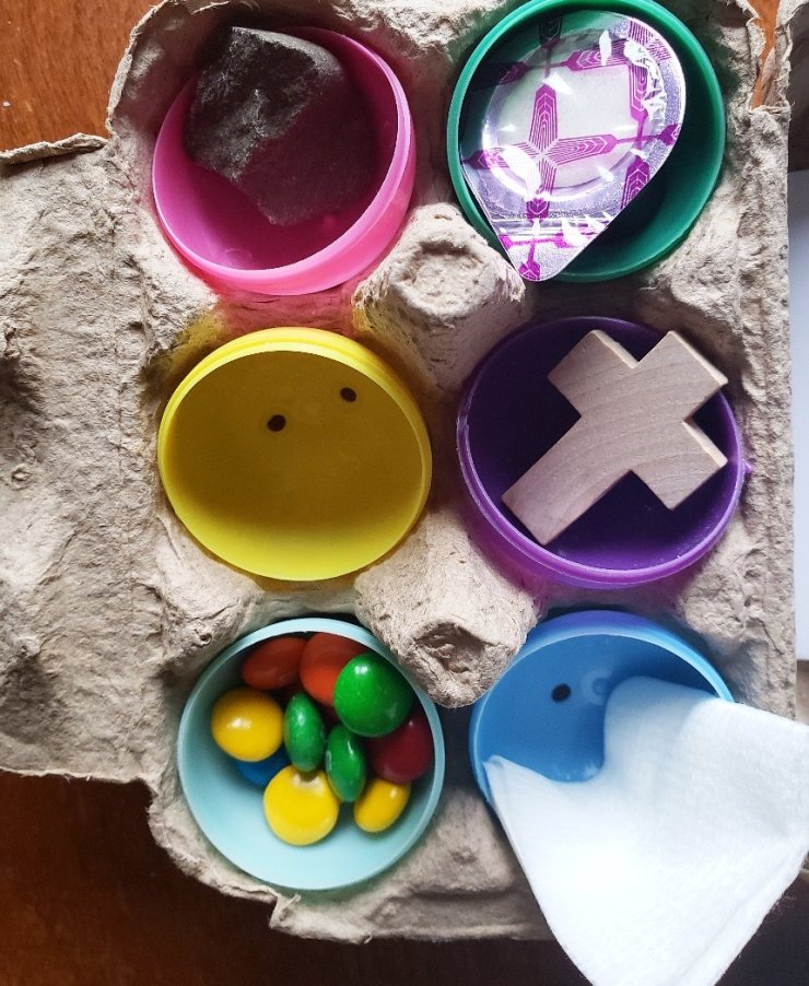 So we made a pint-sized version. 6 colorful eggs, filled with symbols of the story. Perfect for small hands and short attention spans.