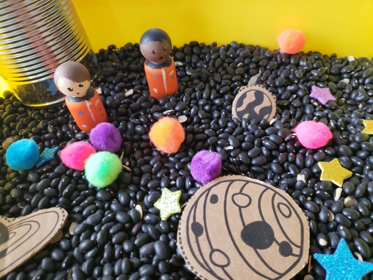 Being that Mae started out this love of space, I made a little space exploration bin. Using black beans as a filler, I threw in some foam stars and pom poms. We were lucky enough to have an Amazon package come in the mail, with planets printed on the side for children to cut out and play with. So we threw those in their too. The final touch was a rocket that I crafted from a tin can and a funnel. I also made a Mae Jemison and a Valentina Tereshkova peg dolls.