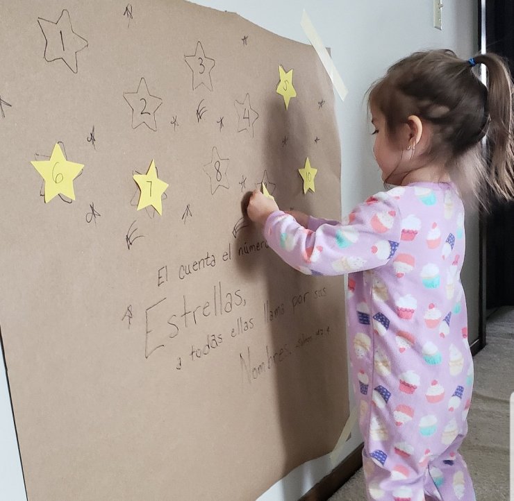 Anyone else have a little astronaut in their home? We recently purchased a book featuring Mae Jemison, and Vale immediately fell in love with the stars and space exploration. Doing everything to encourage that love of STEM, I’m totally milking this for all it’s worth, and we used this love of space to explore Psalm 147:4.