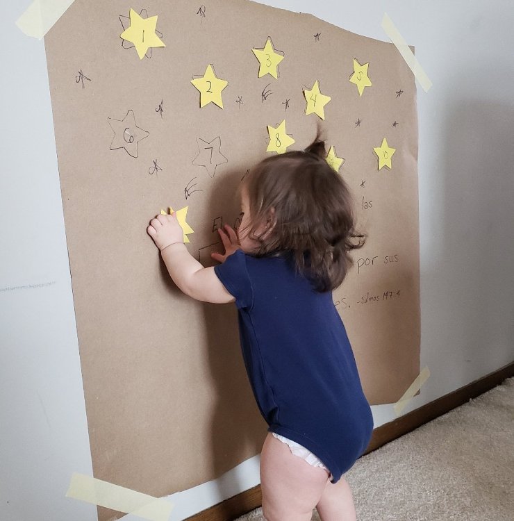 Using craft paper and construction paper, we made a quick number matching game. I hung the craft paper on the wall and drew 10 stars. I labeled the stars 1-10. Then I cut 10 stars from construction paper and labeled them 1-10. I also wrote our scripture vers of the week on the craft paper. Then Vale had fun matching the numbers. When she was finished matching the numbers, we counted the stars. This worked on number recognition, counting skills, and was good vertical play.
