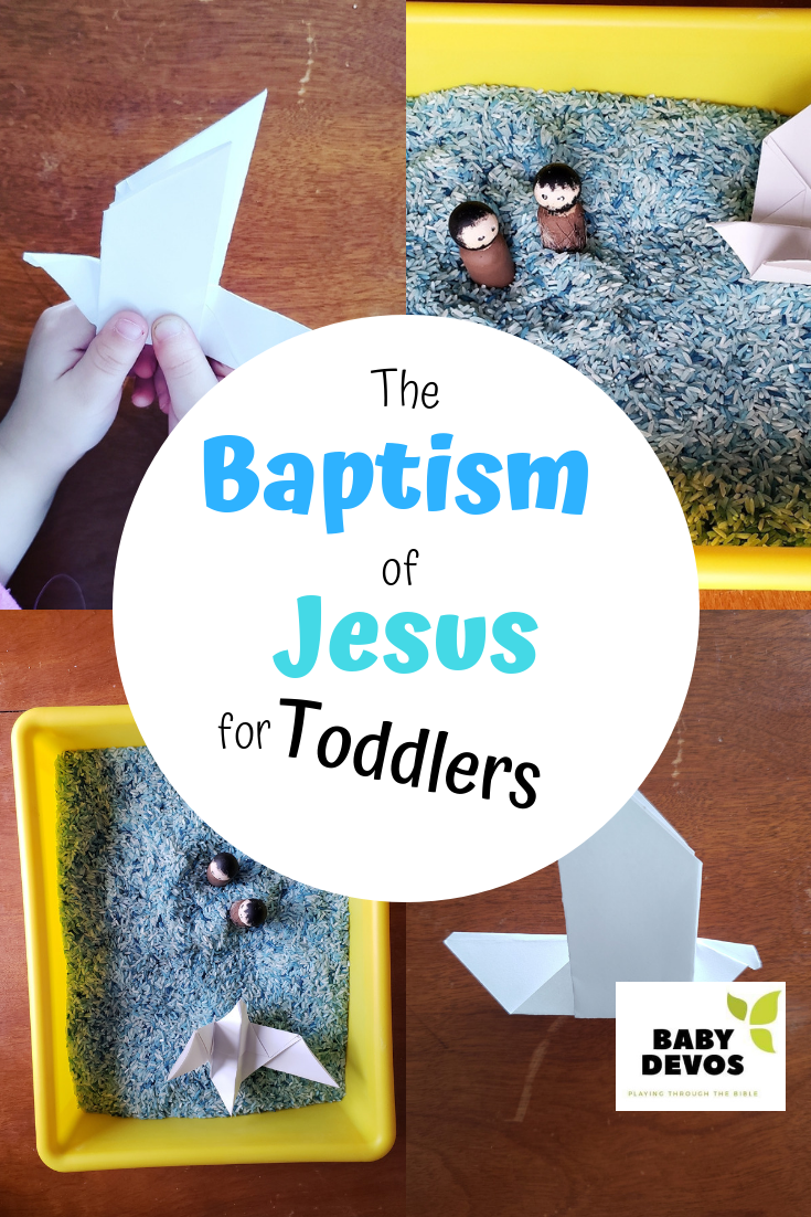 We simply reenacted this story using a sensory bin. I thought of using a water table, but when you’re actually immersing people under water, I didn’t want the toddlers to get the wrong idea and “baptize” each other.