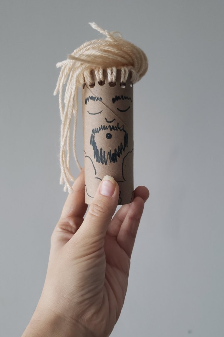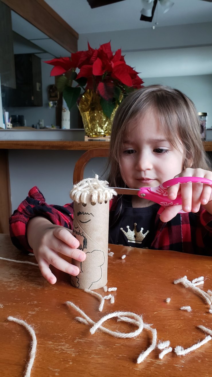 We’ve been working on scissor skills over here, and this is such a great story to do this. I whipped up a little Samson man with a cardboard tube and some yarn. Then let Vale go for it, giving Samson a haircut.