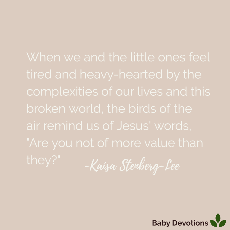 Richard Louv writes in his book, ‘Vitamin N,’ the following, “Take a break. Look at the clouds. Listen to the wind. Let the birds do the heavy lifting.” What a lovely reminder of how God wants to meet us in and through His creation. When we and the little ones feel tired and heavy-hearted by the complexities of our lives and this broken world, the birds of the air remind us of Jesus’ words, “Are you not of more value than they?” (Matthew 6:26).