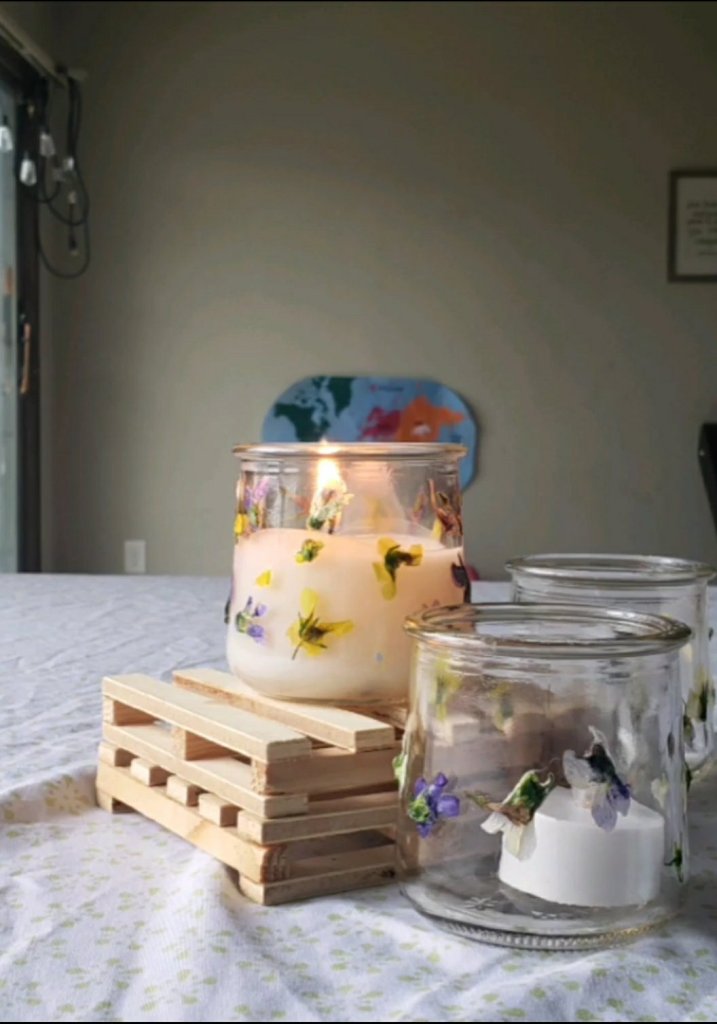 Anyone else have a small collection of French yogurt jars sitting around? On occasion I like to treat myself and feel fancy, so we’ll pick up a pack, which has lead to a small collection. Luckily these jars are perfect for crafts! Including these pretty pressed flower candle holders. All you need is to press the flowers, and then modge podge. For tips, check out :How to Modge Podge pressed flowers onto glass surface
