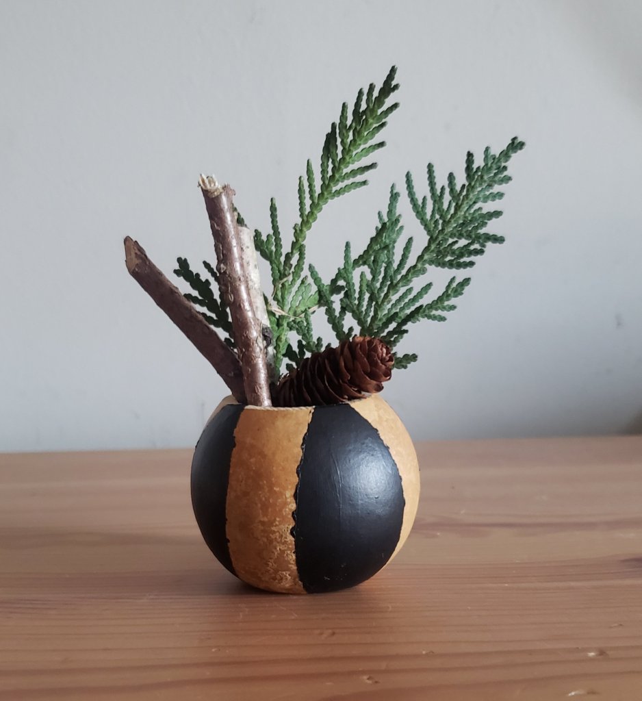 I can NOT get over how much I LOVE these dried gourds. They come in various sizes, for a variety of uses. Use painter’s tape to mark out designs for your little (or if you’re brave let them free hand). Then let them paint. I used painter’s tape and black chalk paint. Then we made mini bouquets for neighbors. These are mini winter green arrangements to help homes feel festive at Christmas.