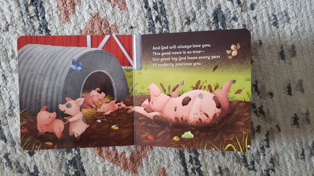 This lovely story explores Romans 8:39 through images of the Farm. Littles who love barnyard will thrill while reading how nothing can separate us from the love of God. Like little cows watching an airplane, God’s love reaches higher than that airplane can go. Or even when we make a wrong choice, like a naughty goat eating up the garden, God still loves us. Nothing can separate us from the love of God.