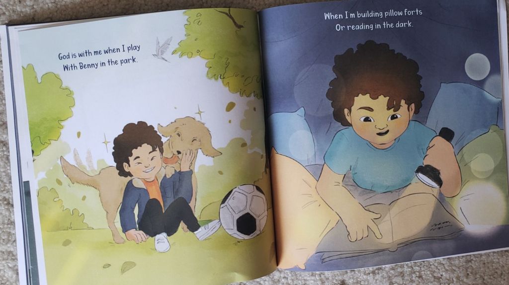 First of all, I love the gentle storytelling in this book, offering littles a relatable scenario and interaction between father and son. The story starts with the son being scared of a thunderstorm. But the father a song sing a song together that reminds them God is always with them. Then closes with a happy, at peace little boy. The song takes up the bulk of the book, and it is so sweet. It’s exactly the type of song parents sing with their kids just made up for their home. Like if Bluey or Daniel Tiger was Christian, I could totally see them singing this song. They talk about ‘God is with me when I pray at church,’ but also, ‘God is with me when I play with my puppy at the park.’ ‘God is with me when I talk to Grandpa’ and when I ‘read in the dark.’